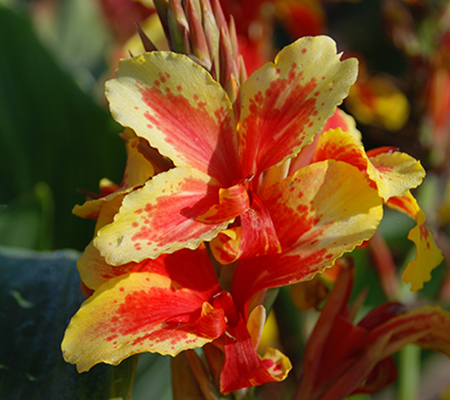 Dans cet article vous allez retrouver tous nos conseils pour réussir la plantation et la culture des cannas. Ces plantes rhizomateuses font partie de la production phare d'Ernest TURC. Nous cultivons les cannas depuis des dizaines d'années et nombreuses sont les créations qui ont vu le jour dans nos champs. Cette fleur élégante offre de multiples facettes. Son feuillage décoratif aux allures exotiques ainsi que ses inflorescences aux couleurs flamboyantes lui donne son allure majestueuse. Nous distinguons les cannas hauts qui forment de véritables haies végétales des cannas nains qui peuvent être cultivés en pots. Les cannas se cultivent très facilement et demandent peu d'entretien.