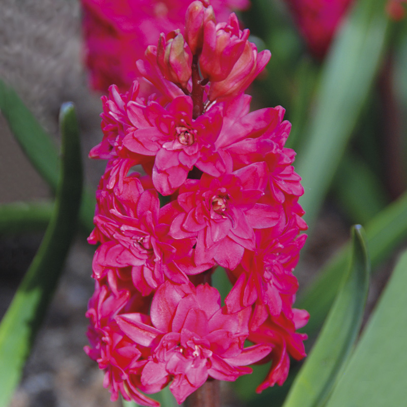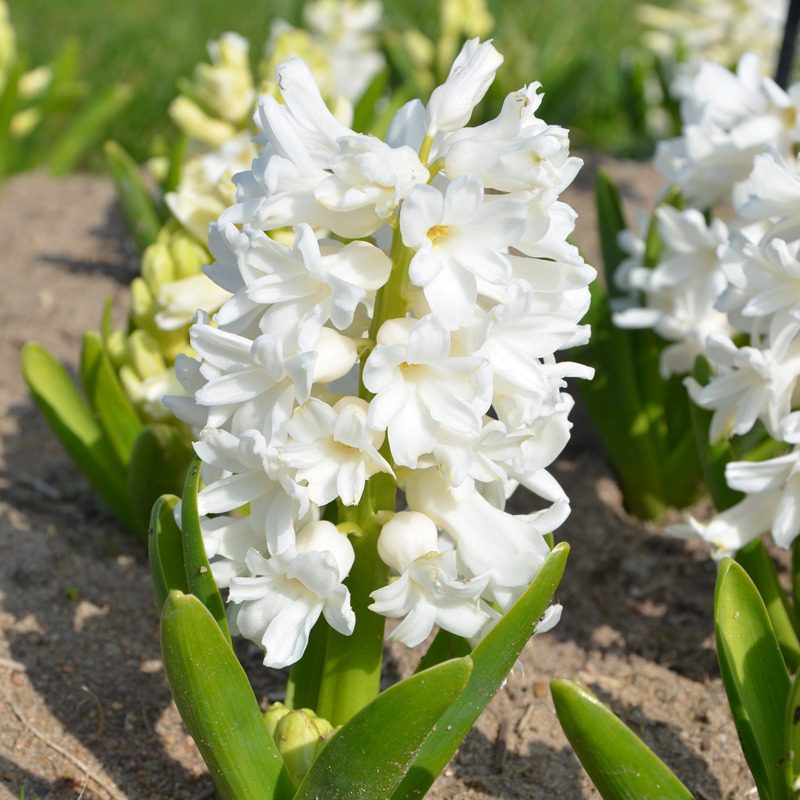 La jacinthe est une bulbeuse incontournable du printemps ! Du haut de ses 20 à 25 cm de hauteur, elle produit de mars à avril des inflorescences droites de 8 à 10 cm de diamètre aux multiples fleurons en étoiles de couleur varié. Avec leur parfum envoutant et leur floraison précoce, les jacinthes offrent les premières notes florales de l'arrivée du printemps. Grâce à leur faible hauteur elles sont particulièrement adaptées au fleurissement des potées fleuries et jardinières pour illuminer les balcons et terrasses. Elles peuvent également être plantées en massifs et bordures où elles feront sensation associées à des plantes bisannuelles et d'autres bulbeuses à floraison précoce comme les crocus à grandes fleurs, les tulipes fosteriana ou encore les muscaris armeniacum.