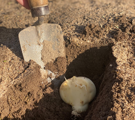 Privilégier l’utilisation d’un plantoir à bulbes qui bénéficie d’un fond plat pour permettre le contact entre la base du bulbe et la terre. Recouvrir de terre et arroser immédiatement après la plantation pour que la terre adhère bien autour des bulbes.