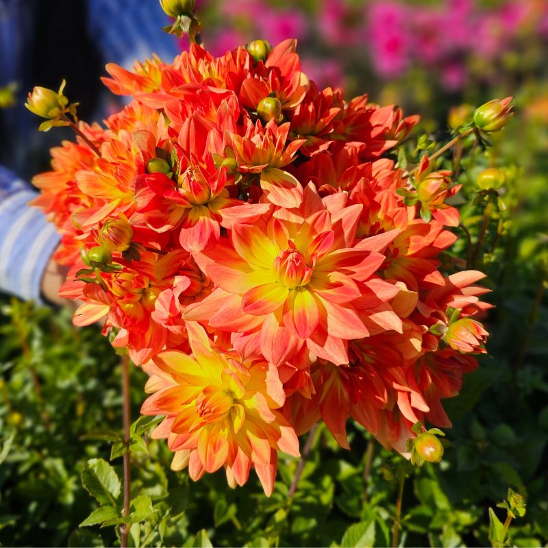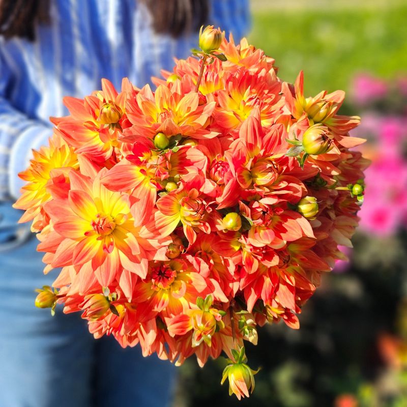 Créé avec Ernest Turc à l’occasion des 50 ans de l’association étudiante Expo Flo, issue d’une école d’ingénieur en horticulture et paysage, le Dahlia ‘Expo Flo®’ incarne la passion du végétal. Cette variété se distingue par ses fleurs orange intense et d’un jaune éclatant, généreuses et lumineuses, d’environ 12 cm de diamètre. D’un port élégant de 90 cm de haut, elle fleurit précocement et avec abondance de juillet à novembre, apportant une touche vive aux massifs. Ses tiges rigides en font également un excellent choix pour la fleur coupée, offrant une bonne tenue en vase et des bouquets éclatants de couleur.