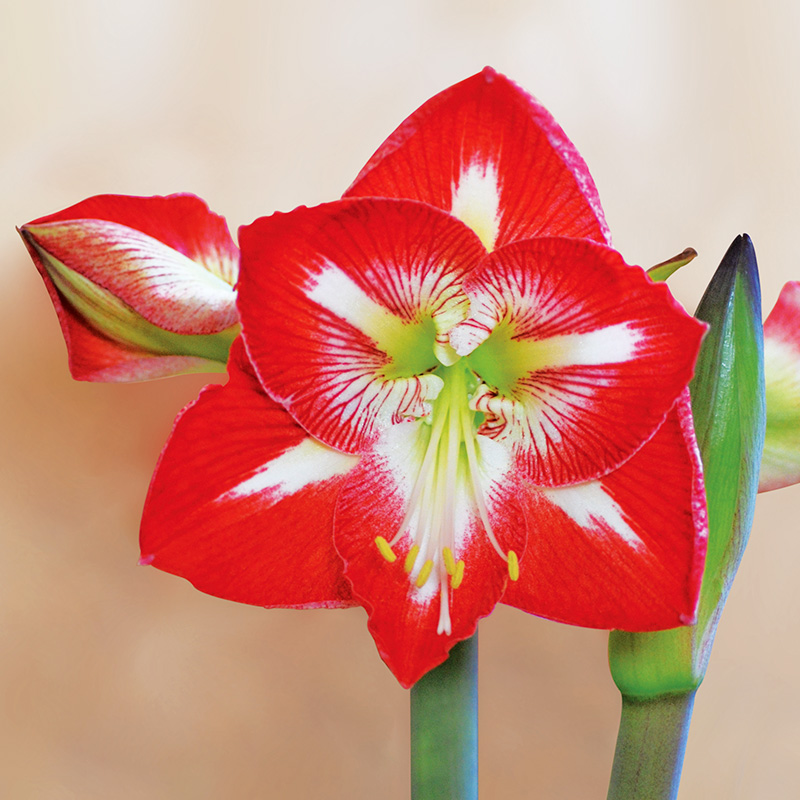 L’Amaryllis Minerve est une bulbeuse exceptionnelle à floraison hivernale de 50 cm de hauteur, qui produit dès le mois de décembre janvier des grandes fleurs étoilées de 17 à 20 cm de diamètre au coloris rouge à cœur blanc.