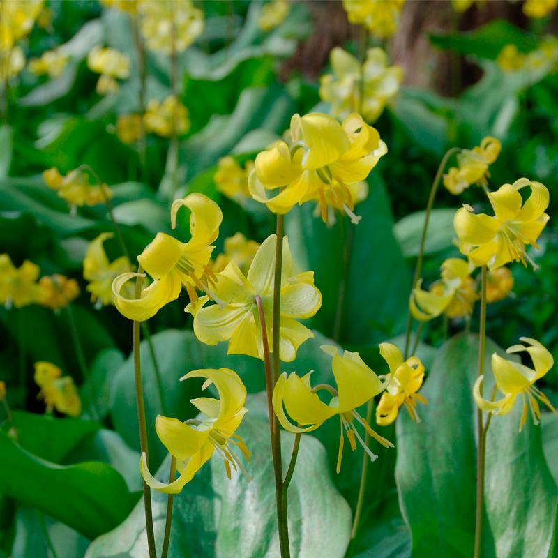 L’Erythronium pagoda est une petite bulbeuse à floraison printanière de 20 à 25 cm de hauteur, qui produit en mars avril des petites grappes de 4 à 5 fleurs en clochettes pendantes de 2 à 3 cm de diamètre au coloris jaune soufre. Plantés en sols frais, voire humides, les erythronium sont très faciles à cultiver, et s’installent rapidement pour former des tapis de fleurs jaune vif, semblables à des boutons d’or, qui seront du plus bel effet dans des massifs un peu sauvages, en pied d’arbres ou en sous-bois clair.