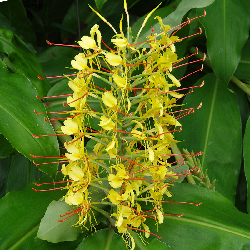 L’Hedychium Gardnerianum est une plante rhizomateuse exotique très parfumée qui peut s’adapter facilement aux climats tempérés. Aussi appelé Longose ou gingembre Kahili, l’hédychium mesure 1,30 m de haut et possède de nombreuses fleurs jaunes parfumées aux étamines rouge orangé.