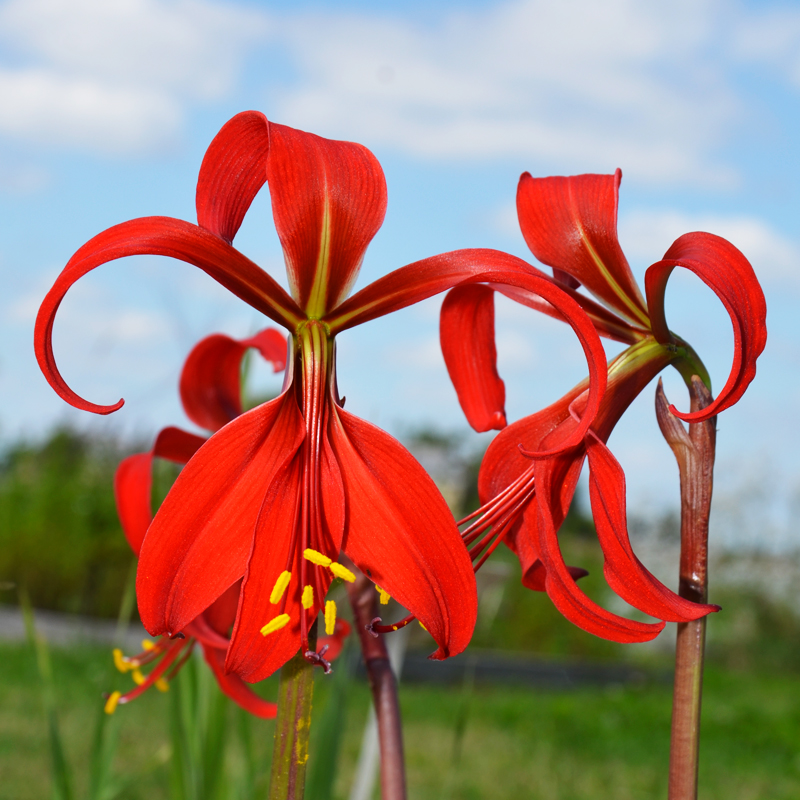 Le lis St Jacques est originaire du Mexique et du Guatemala. De la même famille que l’Amaryllis, il fleurit avant que les feuilles ne se développent. Il produit une magnifique fleur solitaire de 10 cm de diamètre rouge sang évoquant la croix de Saint Jacques.