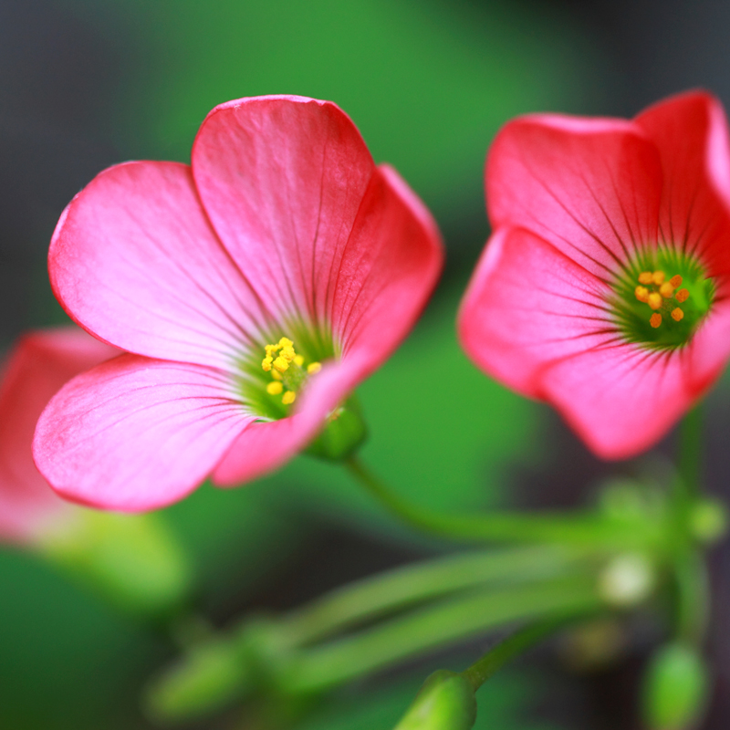L’Oxalis deppei, communément appelé Faux trèfle à 4 feuilles, développe un feuillage en forme de trèfle. Chaque feuille est verte et noire à la base, ce qui rend ce feuillage si particulier et décoratif. L’oxalis deppei produit également de grandes tiges, qui surplombent son feuillage, aux bouts desquelles se développent de délicates fleurs roses au coeur vert. Les petites fleurs se ferment la nuit pour s’ouvrir dès que le soleil fait son apparition.