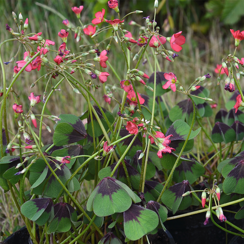 L’Oxalis deppei, communément appelé Faux trèfle à 4 feuilles, développe un feuillage en forme de trèfle. Chaque feuille est verte et noire à la base, ce qui rend ce feuillage si particulier et décoratif. L’oxalis deppei produit également de grandes tiges, qui surplombent son feuillage, aux bouts desquelles se développent de délicates fleurs roses au coeur vert.