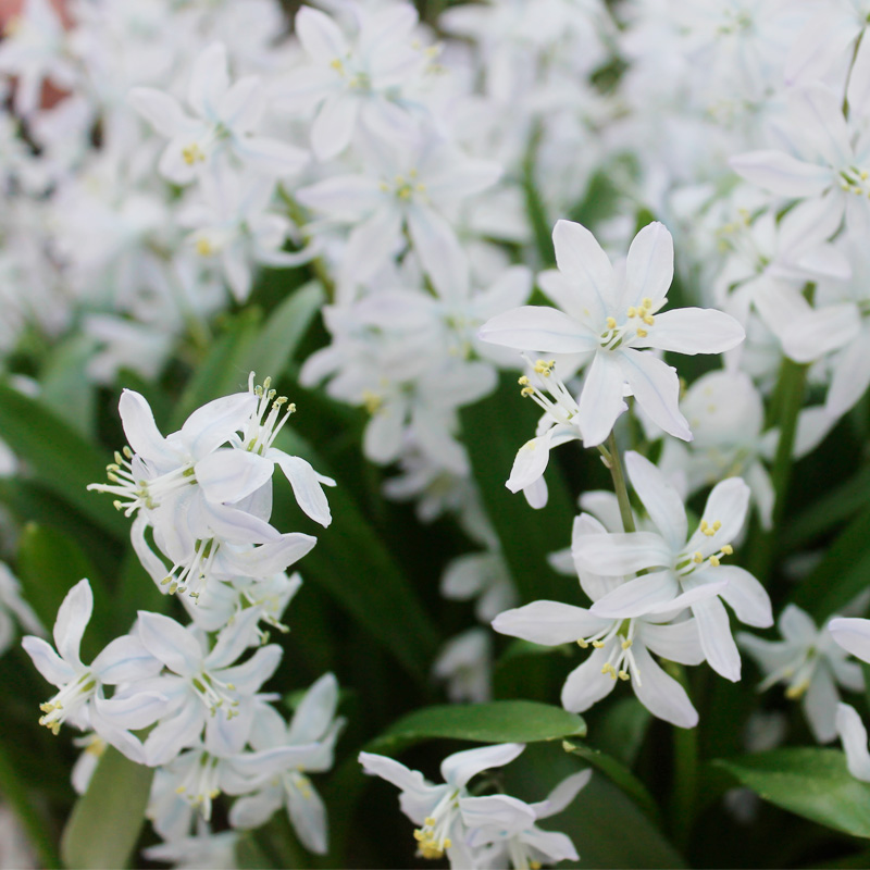 La Scille siberica Alba est une jolie petite bulbeuse à floraison printanière de 12 à 15 cm de hauteur, qui produit en mars avril des petites grappes de 4 à 5 fleurs en clochettes pendantes de 2 cm de diamètre au coloris blanc pur. Plantées en sols frais, voire humides, les scilles de Sibérie sont très faciles à cultiver, et s’installent rapidement pour former des tapis de fleurs bleues qui seront du plus bel effet dans des massifs un peu sauvages, en pied d’arbres, sous-bois clair et même en potée fleurie, associées à des muscaris ou des crocus.