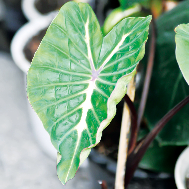 Le Colocasia escuelenta White Lava est une plante bulbeuse au feuillage décoratif, en effet au jardin ou planté en pot cette variété ne passera pas inaperçue. Elle développe de larges feuilles vertes originales veinées de blanc crème. La bande centrale plus clair suit les veinures de la feuilles et lui donne un effet remarquable. Elle peut mesurer jusqu’à 110 cm en saison.
