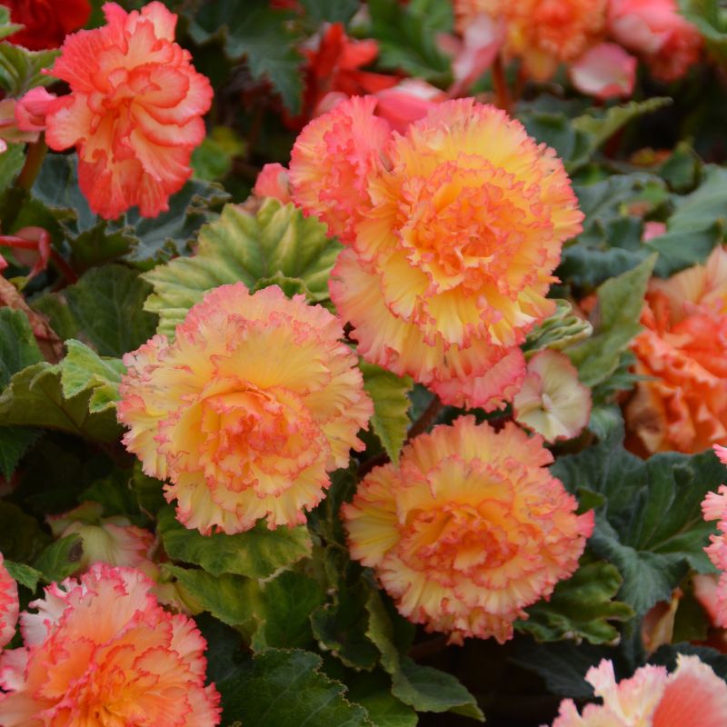 Le bégonia Prima Donna Aurore® produit des très grandes fleurs de près de 15 cm de diamètre, aux pétales finement frangés, jaune orangé à bord saumon, portées sur un feuillage vert franc, épais et dense. Avec son port érigé, ce bégonia de 40 cm aux couleurs lumineuses est parfaitement adapté à la culture en massif, pot ou jardinière. Il est idéal pour fleurir vos espaces mi-ensoleillés ou ombragés.
