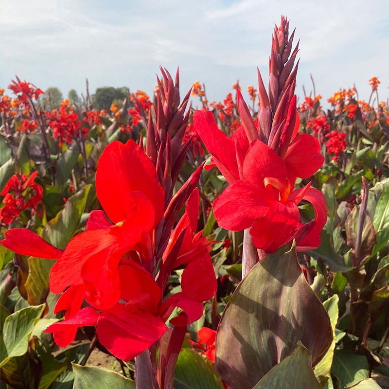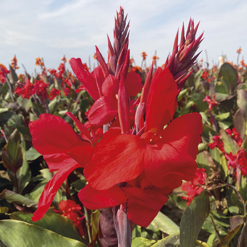 Le Canna Assaut est une création Ernest Turc de 110 cm de haut à l’allure tropicale, qui produit une végétation dense aux feuilles larges de couleur pourpre, et à l’intérieur de laquelle se développent des bouquets de fleurs rouge écarlate dès le mois de juillet et jusqu’aux premières gelées. Avec sa végétation haute, ce canna sera idéal en fond de massif varié où il apportera une note contrastée et graphique à votre jardin. Si vous souhaitez créer des massifs originaux vous pouvez l’associer au dahlia balle ‘Jowey Martina’ et au dahlia cactus ‘Flash’. Originaire des Antilles, le canna, dont le nom d’origine est « Balisier », a été introduit en Europe au XVIe siècle. Depuis, de nombreuses améliorations ont été apportées aux cannas qui se différencient par la couleur de leurs feuilles et par leur hauteur.