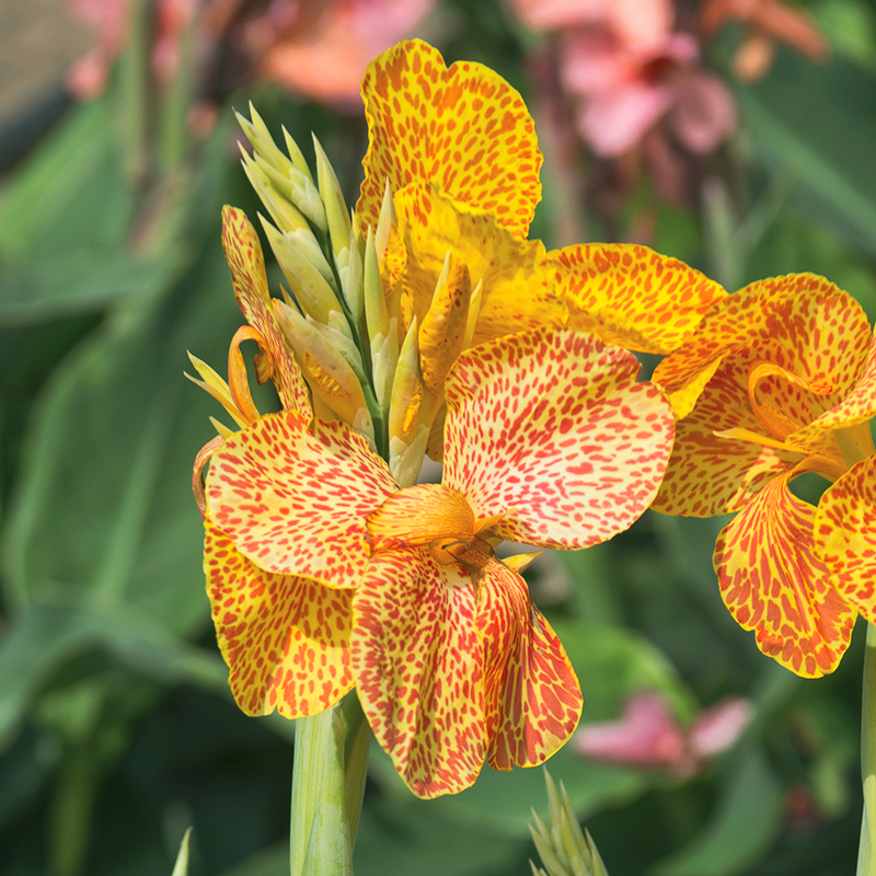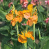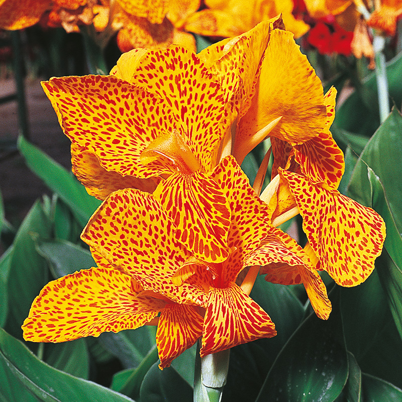 Le Canna En Avant est une variété de 110 cm de haut à l’allure tropicale, qui produit une végétation dense aux feuilles larges de couleur verte, et à l’intérieur de laquelle se développent des bouquets de fleurs jaunes piquetées de rouge dès le mois de juillet et jusqu’aux premières gelées. Avec sa végétation haute, ce canna sera idéal en fond de massif varié où il apportera une note radieuse et graphique à votre jardin. Si vous souhaitez créer des massifs originaux vous pouvez l’associer au dahlia buisson ‘Tour du Monde’ et au dahlia décoratif ‘Clown’. Originaire des Antilles, le canna, dont le nom d’origine est « Balisier », a été introduit en Europe au XVIe siècle. Depuis, de nombreuses améliorations ont été apportées aux cannas qui se différencient par la couleur de leurs feuilles et par leur hauteur.