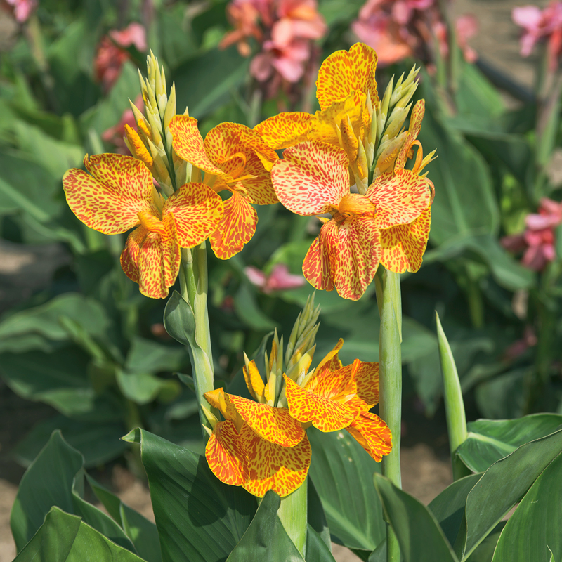 Arrosez vos cannas régulièrement pour maintenir votre terre fraiche et humide. Une fois par mois, n’hésitez pas à faire un apport d’engrais pour plantes fleuries, et particulièrement au moment de la floraison. Les cannas ne nécessitent que peu d’entretien ; éliminez simplement les fleurs fanées régulièrement pour favoriser l’apparition de nouvelles fleurs. A partir des premières gelées, coupez le feuillage au niveau du sol. Si vous habitez dans une région à hiver doux, vous pouvez laisser vos cannas en terre en les protégeant des légères gelées avec un paillis végétal. Par contre, dans les zones à hiver plus rude, il est recommandé de retirer les souches de terre et de les conserver dans un endroit frais et sec avant de les replanter le printemps suivant.