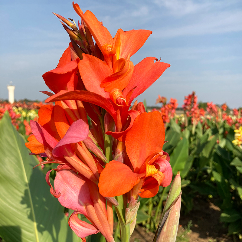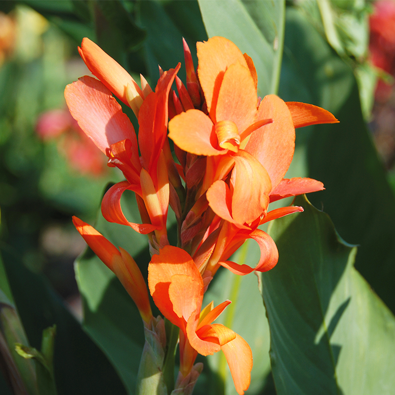 Le Canna Indiana est une création Ernest Turc de 150 cm de haut à l’allure tropicale, qui produit une végétation dense aux feuilles larges de couleur verte, et à l’intérieur de laquelle se développent des bouquets de fleurs orange dès le mois de juillet et jusqu’aux premières gelées. Avec sa végétation haute, ce canna sera idéal en fond de massif varié où il apportera une note chaude et graphique à votre jardin. Si vous souhaitez créer des massifs originaux vous pouvez l’associer aux dahlias décoratifs ‘Chateau d’Urville’ et ‘Bangkok violet’. Originaire des Antilles, le canna, dont le nom d’origine est « Balisier », a été introduit en Europe au XVIe siècle. Depuis, de nombreuses améliorations ont été apportées aux cannas qui se différencient par la couleur de leurs feuilles et par leur hauteur.