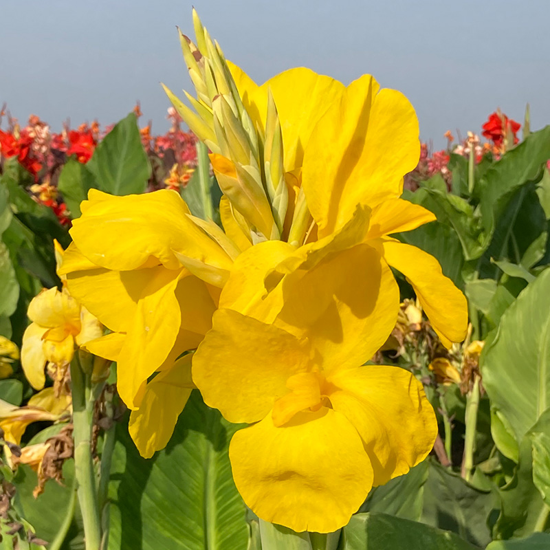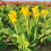 Le Canna Panama est une création Ernest Turc de 130 cm de haut à l’allure tropicale, qui produit une végétation dense aux feuilles larges de couleur verte, et à l’intérieur de laquelle se développent des bouquets de fleurs jaune éclatant dès le mois de juillet et jusqu’aux premières gelées. Avec sa végétation haute, ce canna sera idéal en fond de massif varié où il apportera une note radieuse et graphique à votre jardin. Si vous souhaitez créer des massifs originaux vous pouvez l’associer aux dahlias pompon ‘Ashado’ et ‘Artaban’. Originaire des Antilles, le canna, dont le nom d’origine est « Balisier », a été introduit en Europe au XVIe siècle. Depuis, de nombreuses améliorations ont été apportées aux cannas qui se différencient par la couleur de leurs feuilles et par leur hauteur.