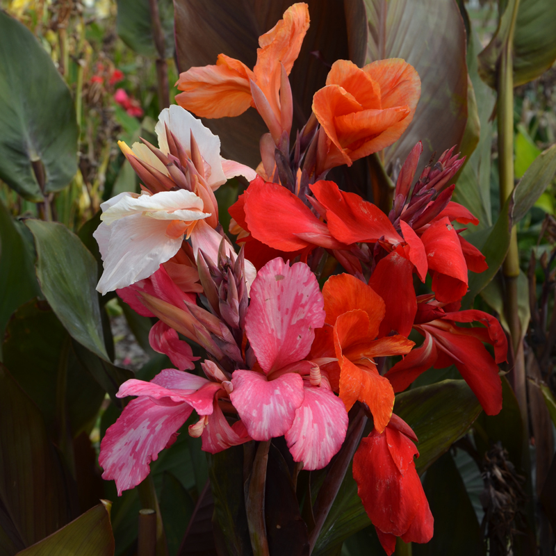 Les Canna hauts variés à feuillage pourpre sont des plantes à l’allure tropicale, qui produisent une végétation dense aux feuilles larges de couleur sombre, et à l’intérieur de laquelle se développent des bouquets de fleurs colorées dès le mois de juillet et jusqu’aux premières gelées. Avec leur végétation haute d’environ 120 cm, ces cannas seront parfaits en fond de massif où ils apporteront des notes chaudes et graphiques à votre jardin. Si vous souhaitez créer des massifs originaux, vous pouvez les associer à des dahlias hauts ou des alstroemères. Originaire des Antilles, le canna, dont le nom d’origine est « Balisier », a été introduit en Europe au XVIe siècle. Depuis, de nombreuses améliorations ont été apportées aux cannas qui se différencient par la couleur de leurs feuilles et par leur hauteur.