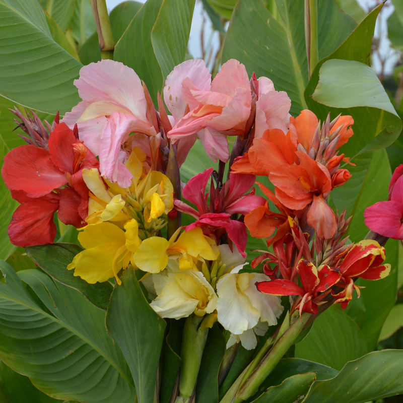 Les Canna hauts variés à feuillage vert sont des plantes à l’allure tropicale, qui produisent une végétation dense aux feuilles larges de couleur verte, et à l’intérieur de laquelle se développent des bouquets de fleurs colorées dès le mois de juillet et jusqu’aux premières gelées. Avec leur végétation haute d’environ 130 cm, ces cannas seront parfaits en fond de massif où ils apporteront des notes chaudes et graphiques à votre jardin. Si vous souhaitez créer des massifs originaux, vous pouvez les associer à des dahlias hauts ou des alstroemères. Originaire des Antilles, le canna, dont le nom d’origine est « Balisier », a été introduit en Europe au XVIe siècle. Depuis, de nombreuses améliorations ont été apportées aux cannas qui se différencient par la couleur de leurs feuilles et par leur hauteur.
