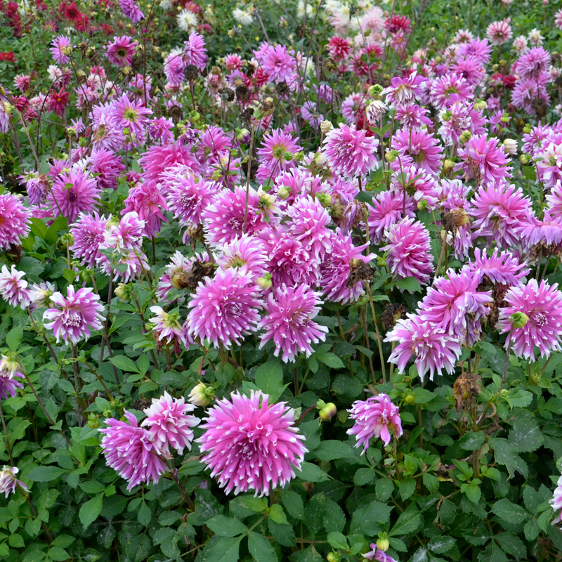 Le dahlia se cultive facilement. Arrosez-le régulièrement pendant les premières semaines de développement pour favoriser son enracinement. Formez une cuvette au niveau du pied et arrosez de préférence à cet endroit dès que la végétation prend de l’ampleur. Si la température excède 25 °C, arrosez de préférence le soir, en mouillant le moins possible le feuillage. Pour favoriser sa ramification, il est recommandé d’étêter les jeunes pousses en tout début de culture, lorsque celles-ci auront atteint le stade de 4 à 6 feuilles. Dans la pratique, il suffit de supprimer avec vos ongles le bourgeon terminal, ce qui va entrainer le développement des bourgeons axillaires présents à l’aisselle de chaque feuille. Cette petite intervention vous permettra d’obtenir des plantes plus développées, plus buissonnantes, et donc par conséquent plus florifères ! Le dahlia cactus fait partie des dahlias de grande taille, alors n’hésitez pas à ajouter un tuteur au pied de votre plante si elle dépasse 90 cm. Prenez le soin de retirer les fleurs fanées au cours de la floraison, cela permet de favoriser le développement de nouvelles fleurs jusqu’aux gelées. A la fin de l’automne, une fois que le feuillage commence à noircir, coupez les tiges au ras du sol. Si vous habitez dans un endroit où les hivers sont rudes, il est préférable de retirer le bulbe de terre. Sinon, dans les régions aux hivers cléments, et si votre terre n’est pas trop lourde et gorgée d’eau, vos bulbes peuvent passer l’hiver en terre, idéalement sous un épais paillage. Les bulbes de dahlias se conservent dans un endroit frais et sec à l’abri de la lumière. Une fois l’hiver et les dernières gelées passées vous pouvez replanter vos bulbes en pleine terre.