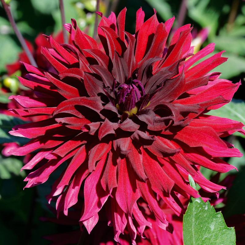 Le Dahlia cactus nain Leslie mesure environ 65 cm de hauteur et produit de belles fleurs rouge grenat très intenses d’environ 12 cm de diamètre. Il convient aussi bien en pots qu’en massifs. Planté au jardin il vous permettra de jouer sur les hauteurs avec des variétés hautes et des bulbes divers plus petits. Cultivé en grands pots, il vous permettra de colorer vos balcons ou terrasses. Vous pouvez l’associer à des fleurs de couleur pêche ou saumonée, comme avec le Dahlia ‘Pomme d’Amour’ ou encore le canna nain ‘Gnom’.