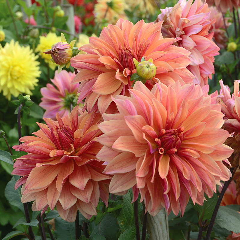 Le Dahlia décoratif Caméléon porte bien son nom, il offre de grandes fleurs d’environ 18 cm de diamètre de couleur orange aux reflets carmin, portées sur des tiges sombres qui mettent merveilleusement en valeur la floraison. Ce dahlia porte son nom car, avec toutes ses nuances, il se fondra parfaitement dans le jardin ! Cette création Ernest Turc de 130 cm de hauteur développe plusieurs rangées de pétales qui forment une fleur généreuse. Ce dahlia est également idéal pour la confection de bouquets, où il apportera son originalité et son intensité.
