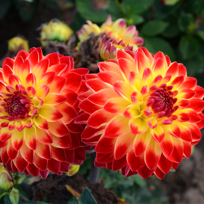 Le Dahlia décoratif Dynastie est une création Ernest TURC datant de 1986 aux coloris chauds et chatoyants, rouge au coeur d’or. D’environ 100 cm de haut, ce dahlia produit des fleurs de 11 cm de diamètre, il est idéal en massifs, bordures, mais aussi pour la confection de bouquets !