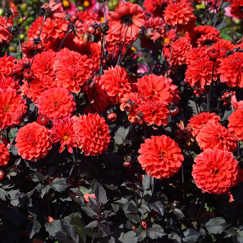 Le Dahlia nain double Septembre à Paris est surprenant, avec son feuillage dense formant un buisson sombre aux reflets bronze, et ses fleurs rouge brillant très lumineuses le survolant délicatement. Particulièrement florifère, cette création Ernest Turc de 70 cm de hauteur produit des fleurs de 10 cm de diamètre en un contraste tout simplement envoûtant ! Particulièrement adapté à la culture en massif, il peut également être cultivé en grand pot où il apportera de l’originalité et de l’intensité à vos balcons et terrasses.