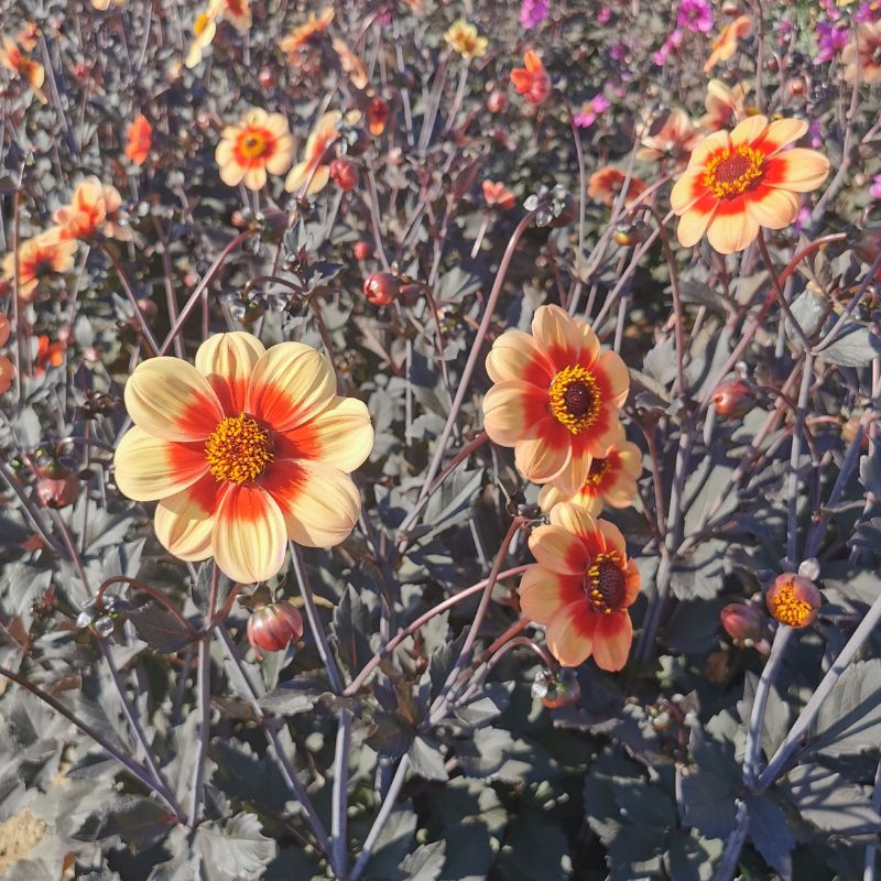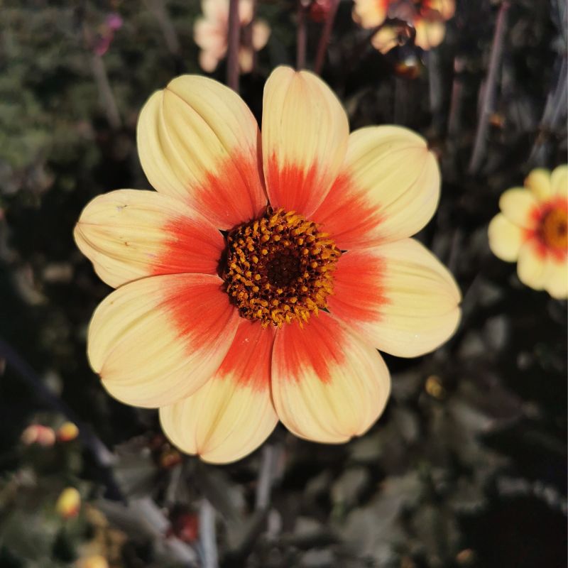 Le Dahlia nain Simple Cordoba est une création Ernest Turc de 2024 dans la série Andalouse. Tout comme les variétés Sevilla et Granada, il séduit par l’originalité de ses fleurs jaunes orangés aux pétales bicolores formant un halo très marqué et contrasté. On apprécie égaement son beau feuillage vert découpé et ses tiges noires. De taille moyenne avec ses 60 cm de haut, ce dahlia peut être cultivé en massif ou en grands pots pour sublimer vos balcons et terrasses durant tous les mois d’été, et jusqu’aux premières gelées. Avec son coeur chargé en pollen, il est particulièrement attractif pour les insectes butineurs du jardin : un vrai atout biodiversité !