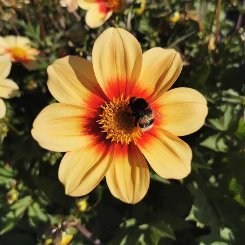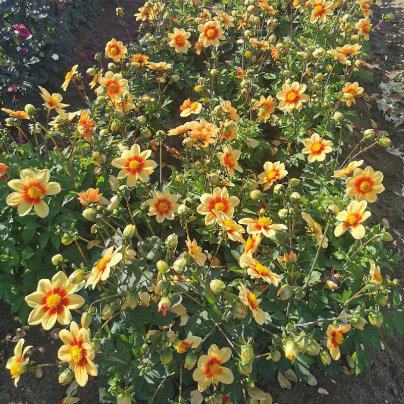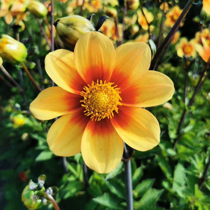 Le dahlia se cultive facilement. Arrosez-le régulièrement pendant les premières semaines de développement pour favoriser son enracinement. Formez une cuvette au niveau du pied et arrosez de préférence à cet endroit dès que la végétation prend de l’ampleur. Si la température excède 25 °C, arrosez de préférence le soir, en mouillant le moins possible le feuillage. Pour favoriser sa ramification, il est recommandé d’étêter les jeunes pousses en tout début de culture, lorsque celles-ci auront atteint le stade de 4 à 6 feuilles. Dans la pratique, il suffit de supprimer avec vos ongles le bourgeon terminal, ce qui va entrainer le développement des bourgeons axillaires présents à l’aisselle de chaque feuille. Cette petite intervention vous permettra d’obtenir des plantes plus développées, plus buissonnantes, et donc par conséquent plus florifères ! Le dahlia Nain simple fait partie des dahlias de taille petite à moyenne, qui ne nécessite pas de tuteurage. Prenez le soin de retirer les fleurs fanées au cours de la floraison, cela permet de favoriser le développement de nouvelles fleurs jusqu’aux gelées. A la fin de l’automne, une fois que le feuillage commence à noircir, coupez les tiges au ras du sol. Si vous habitez dans un endroit où les hivers sont rudes, il est préférable de retirer le bulbe de terre. Sinon, dans les régions aux hivers cléments, et si votre terre n’est pas trop lourde et gorgée d’eau, vos bulbes peuvent passer l’hiver en terre, idéalement sous un épais paillage. Les bulbes de dahlias se conservent dans un endroit frais et sec à l’abri de la lumière. Une fois l’hiver et les dernières gelées passées vous pouvez replanter vos bulbes en pleine terre.