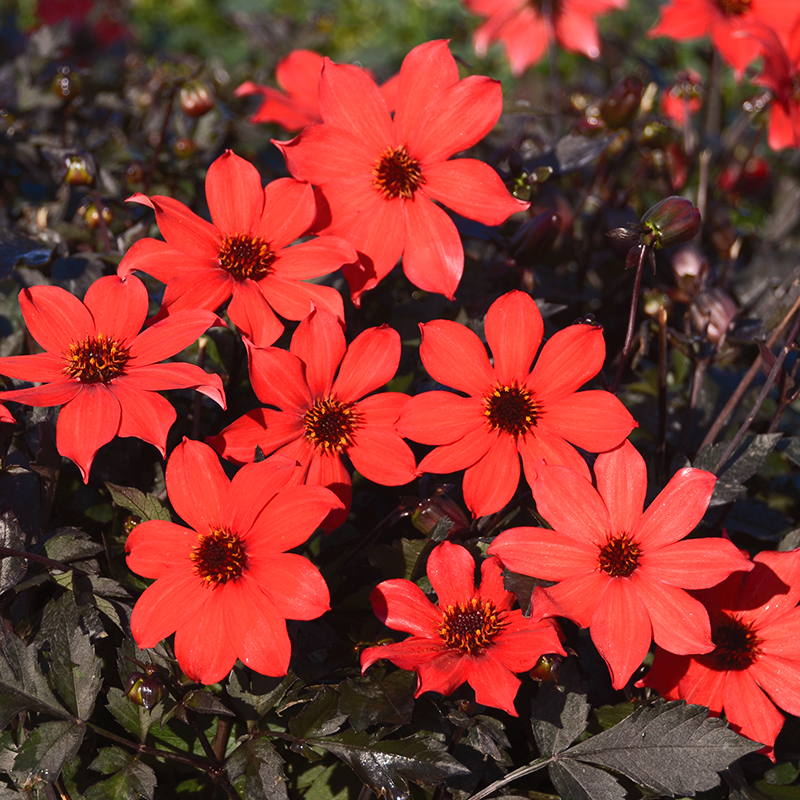 Le Dahlia nain Simple Pampa produit de magnifiques fleurs d’un diamètre de 9 cm, d’un rouge intense et à la forme étoilée très distinctive, créant un contraste saisissant sur un feuillage noir sublime. Conçue par Ernest Turc, cette variété atteint une hauteur d’environ 60 cm et convient aussi bien pour être plantée en massif et en bordure que dans un grand pot grâce à son port compact.