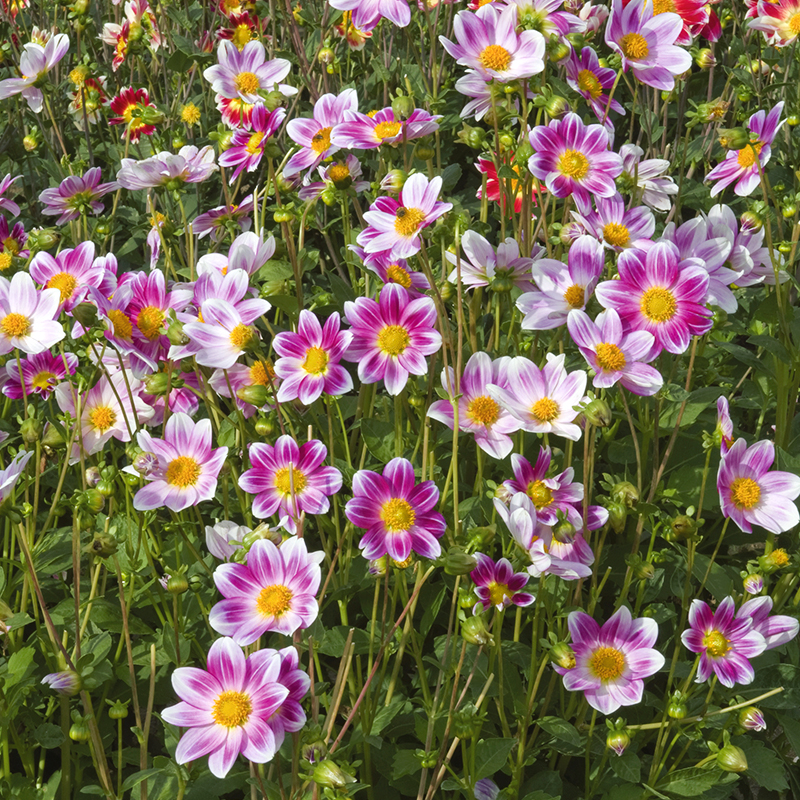 Le Dahlia nain Simple P’tit Coquin Bio produit une multitude de fleurs de 10 cm de diamètre environ, aux pétales pourpres, striés de crème. Du haut de ses 70 cm, cette création Ernest Turc qui a vu le jour en 1988, apportera douceur et fraîcheur à vos massifs et bordures, et s’adaptera également très facilement à la culture en pot, grâce à sa hauteur et à son port solide. Une chose est sûre, il ne passera pas inaperçu ! Avec son coeur apparent chargé en pollen, ce dahlia a également la particularité d’être mellifère et d’attirer nos amis les insectes butineurs du jardin. Un vrai atout biodiversité !
