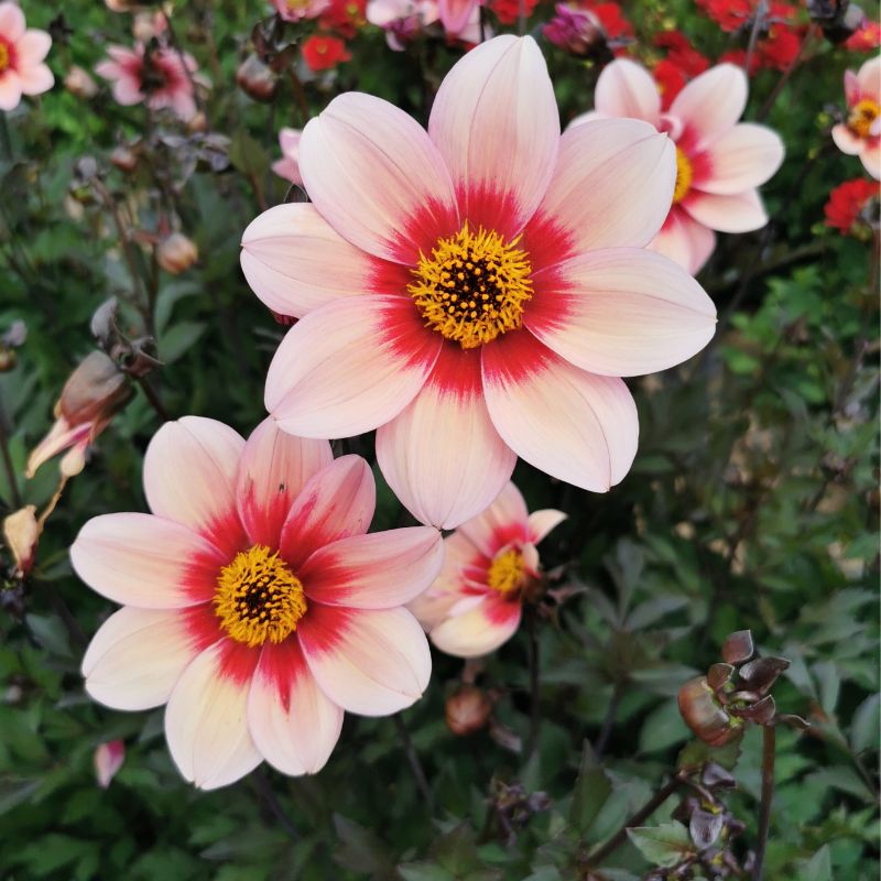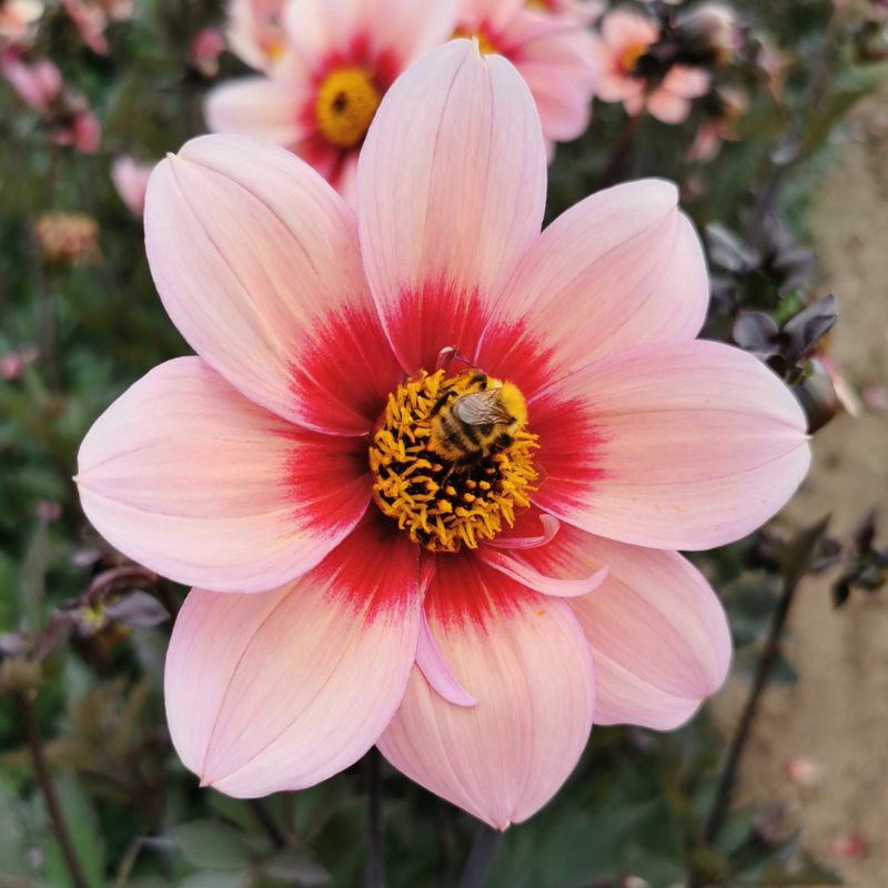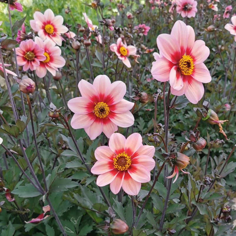 Le Dahlia nain Simple Sévilla est une création Ernest Turc de 2023 dans la série Andalouse. Tout comme les variétés Granada et Cordoba, il séduit par l’originalité de ses fleurs rose aux pétales bicolores formant un halo très marqué et contrasté. On apprécie égaement son beau feuillage pourpre découpé et ses tiges noires. De taille moyenne avec ses 85 cm de haut, ce dahlia peut être cultivé en massif ou en grands pots pour sublimer vos balcons et terrasses durant tous les mois d’été, et jusqu’aux premières gelées. Avec son coeur chargé en pollen, il est particulièrement attractif pour les insectes butineurs du jardin : un vrai atout biodiversité !