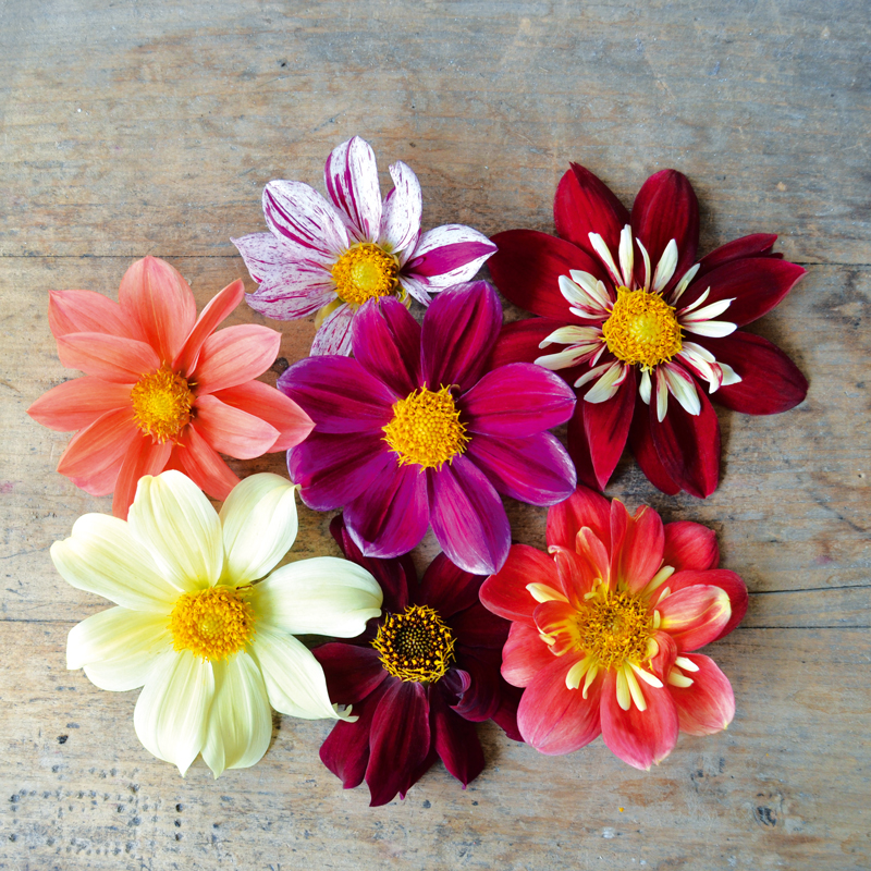 Originaire d’Amérique centrale et principalement du Mexique, le dahlia, utilisé autrefois par les Aztèques comme plante comestible, est importé en Europe au 18ème siècle pour remplacer la pomme de terre. Sans succès… ses qualités décoratives et ornementales ont vite supplanté ses propriétés nutritives, surtout lorsque les premières fleurs doubles de type cactus ont été hybridées. Aujourd’hui, ce sont plus de quarante mille variétés hybrides qui ont été obtenues, pour le plus grand bonheur des amateurs passionnés, des collectionneurs, et des jardiniers. Le genre dahlia offre une diversité fantastique de formes, de hauteurs et de coloris. Il ne lui manque que le parfum… et le pigment bleu pour compléter la gamme de ses coloris !