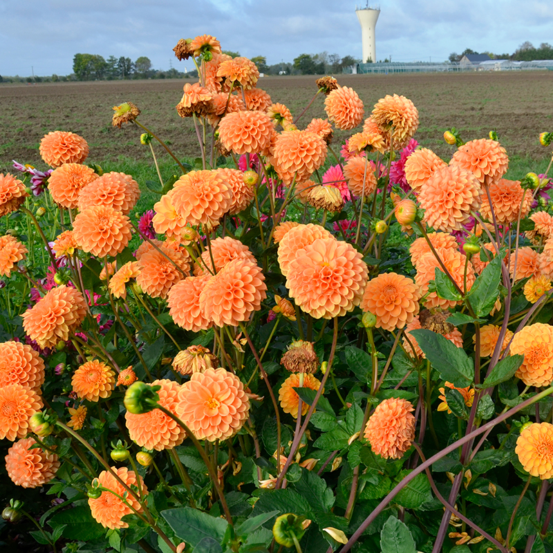 Le Dahlia balle Sylvia Bio produit des fleurs sphériques très régulières, un peu plus grosses que celles des dahlias pompons. Ses inflorescences sont orange et font environ 8 cm de diamètre. Cette plante généreuse de 100 cm fleurira sans discontinuer tout l’été. Cette fleur lumineuse est idéale en fleur coupée grâce à ses tiges longues et solides. Vous pouvez également l’utiliser au jardin pour apporter de la hauteur à vos massifs.