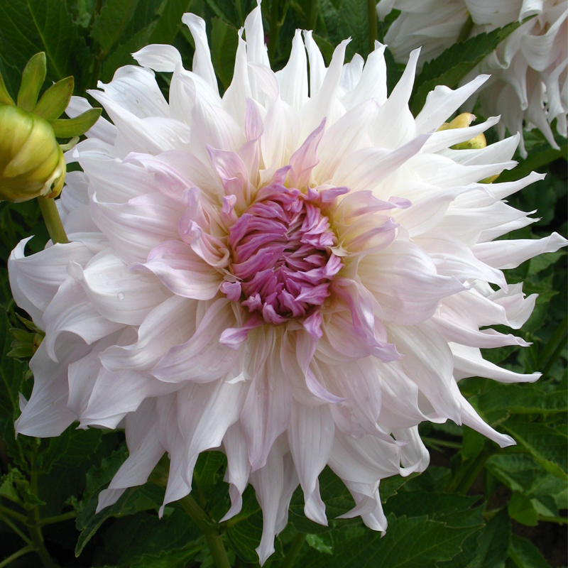Le Dahlia décoratif Shiloh Noelle Bio fait partie de la famille des dahlias à fleurs géantes, et offre de très grandes fleurs doubles d’environ 23 cm de diamètre de couleur blanc rosé au cœur subtilement teinté de parme. Ce dahlia plein de nuances peut être associé à des dahlias aux couleurs douces comme le Dahlia Idylle ou le Dahlia Poésie. Haut de 130 cm, il est idéal en massif et en bouquet où il apportera une touche de douceur à votre intérieur.