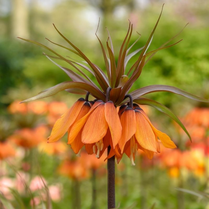 La Fritillaire imperialis Sunset est une bulbeuse originale à floraison printanière de 80 à 90 cm de hauteur, qui produit dès le mois d’avril une couronne de fleurs en calice surmontée d’un toupet de 12 à 15 cm de diamètre au coloris orange intense.