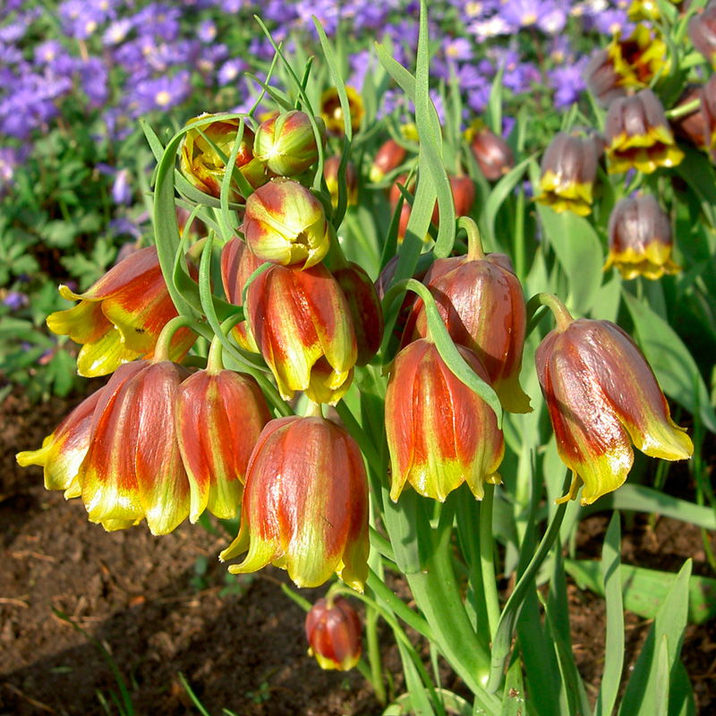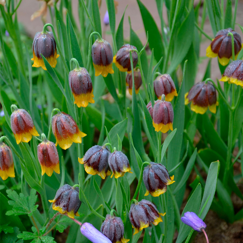 La Fritillaire michailovskyi est une bulbeuse originale à floraison printanière de 20 à 25 cm de hauteur, qui produit en avril mai des fleurs en forme de grosses clochettes de 3 à 4 cm de diamètre au coloris pourpre à bords jaunes.