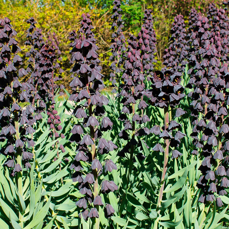 La Fritillaire persica est une bulbeuse originale à floraison printanière de 80 à 90 cm de hauteur, qui produit dès le mois d’avril une longue hampe florale élancée portant de 15 à 20 fleurs en forme de cloches de 10 à 12 cm de diamètre au coloris brun pourpré presque noir. Plantées en tous types de sols bien drainants, les fritillaires de Perse seront du plus bel effet en milieu de massifs, entre des plantes vivaces, bisannuelles ou autres bulbeuses à floraison printanière. La verticalité de ces fleurs originales apportera une touche originale et majestueuse au jardin. Ces belles bulbeuses possèdent un bulbe dont l’odeur assez forte est réputée pour éloigner les taupes et autres rongeurs du jardin. Une fois plantées, l’odeur est cependant presque imperceptible !