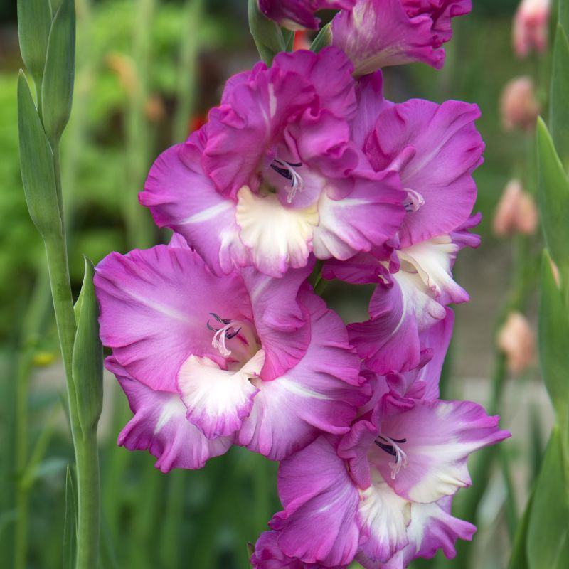 Le Glaïeul à Grandes Fleurs Anouk produit de superbes hampes florales de 120 cm de haut aux nombreux fleurons violets au cœur blanc. Cette variété majestueuse est idéale en bordure ou en massif pour donner de la hauteur à vos espaces et compositions végétales. Fleur à couper par excellence, ils permettent également de composer de somptueux bouquets hauts et très graphiques. Utilisés par les Grecs et les Romains, les glaïeuls ont connu une véritable évolution grâce à d’importants travaux d’hybridation.