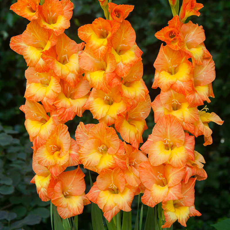 Le Glaïeul à Grandes Fleurs Conca d’Oro produit de superbes hampes florales de 120 cm de haut aux nombreux fleurons orange à macule jaune. Cette variété majestueuse est idéale en bordure ou en massif pour donner de la hauteur à vos espaces et compositions végétales. Fleur à couper par excellence, ils permettent également de composer de somptueux bouquets hauts et très graphiques. Utilisés par les Grecs et les Romains, les glaïeuls ont connu une véritable évolution grâce à d’importants travaux d’hybridation.