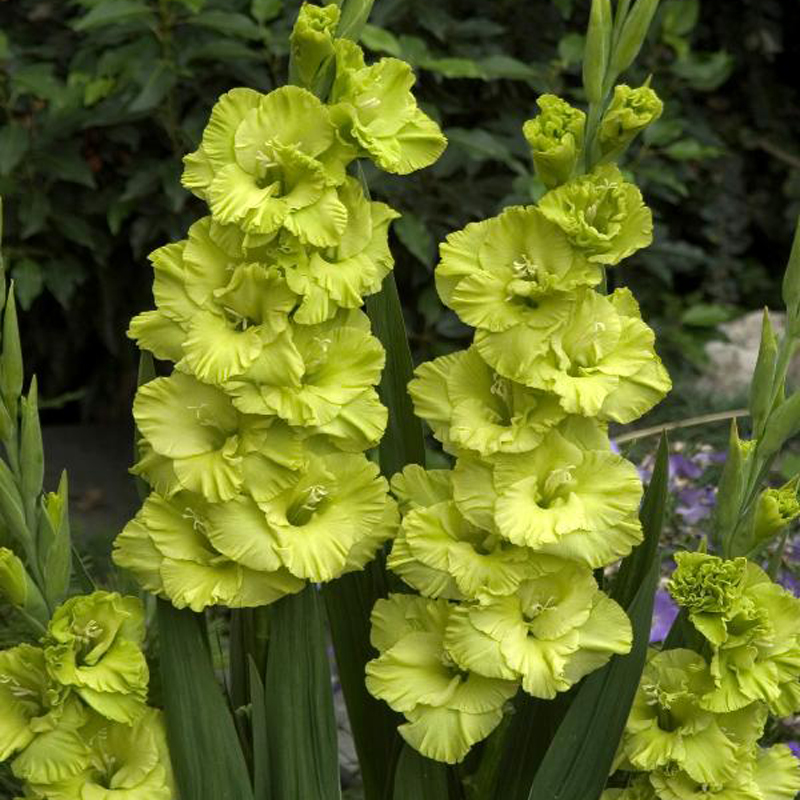 Le Glaïeul à Grandes Fleurs Green Star produit de superbes hampes florales de 120 cm de haut aux nombreux fleurons jaune vert. Cette variété majestueuse est idéale en bordure ou en massif pour donner de la hauteur à vos espaces et compositions végétales. Fleur à couper par excellence, ils permettent également de composer de somptueux bouquets hauts et très graphiques. Utilisés par les Grecs et les Romains, les glaïeuls ont connu une véritable évolution grâce à d’importants travaux d’hybridation.