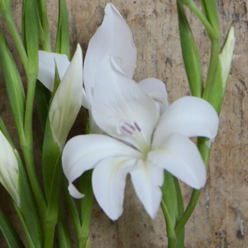 Le Glaïeul Nain colvillei Alba la Fiancée produit de jolies hampes florales de 55 cm de haut aux nombreux fleurons en étoiles blanches. Cette variété naine est idéale en bordure ou en massif pour donner une touche naturelle, légère et un peu sauvage à vos espaces et compositions végétales. Fleur à couper par excellence, ils permettent également de composer de somptueux bouquets élancés et très graphiques. Plus résistants que leurs cousins à grandes fleurs, les glaïeuls colvillei peuvent rester en terre d’une année sur l’autre, protégés par un paillage végétal.