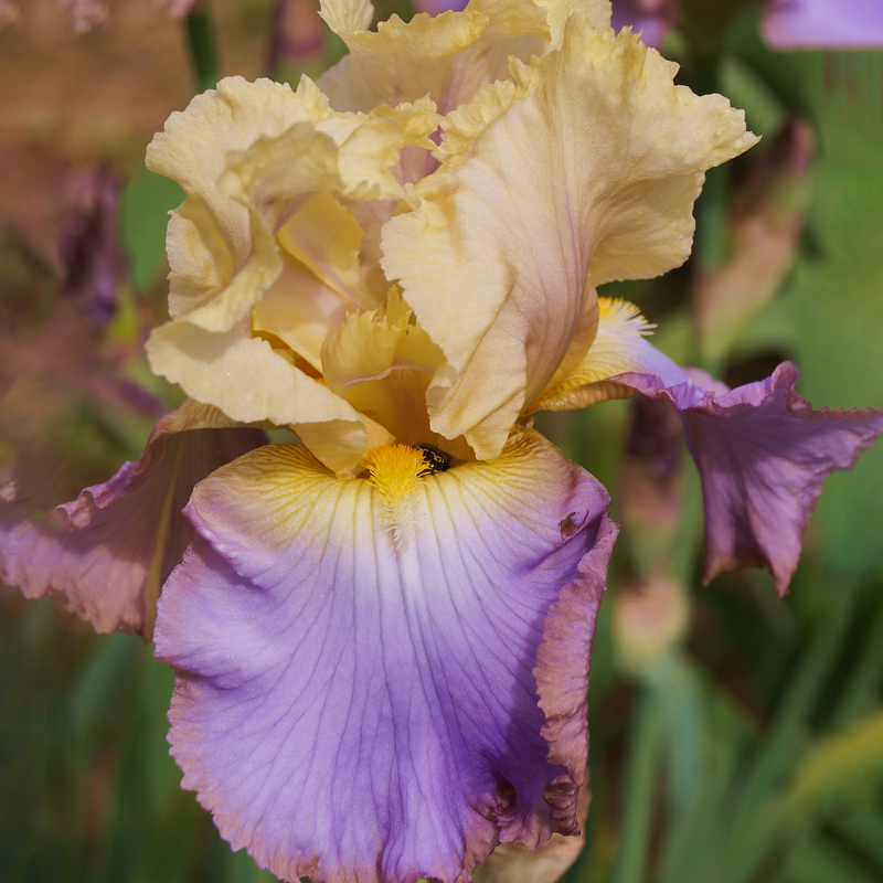 L’Iris germanica Distant Chimes est une plante vivace de 60 cm de haut environ, qui produit des grandes hampes florales droites et bien érigées. Elles portent entre mai et juin des fleurs délicates et élégantes, jaune et mauve, d’environ 10 cm de diamètre, qui sortent d’un feuillage aux larges feuilles raides vert glauque. Les fleurs de l’Iris germanica ont la particularité de former trois gros pétales et trois sépales retombants, appelés “barbe”. Les Iris germanica, ou Iris des jardins, sont très appréciés en massif, bordure et rocaille de jardins secs.