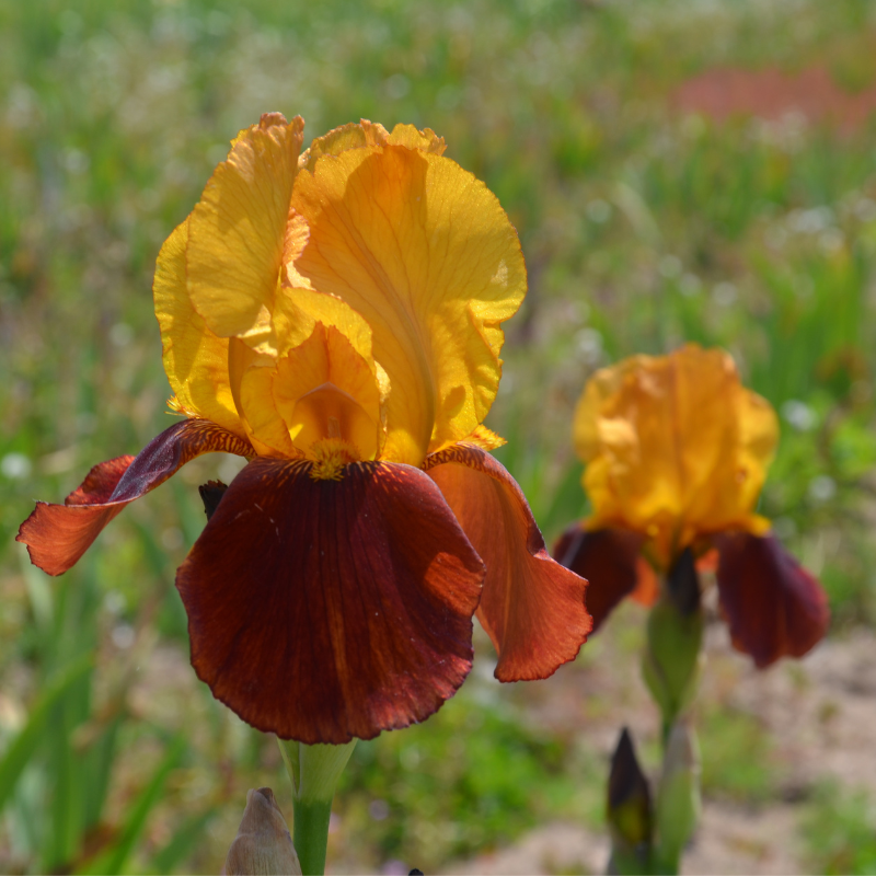 L’Iris germanica Gai Luron est une plante vivace de 60 cm de haut environ, qui produit des grandes hampes florales droites et bien érigées. Elles portent entre mai et juin des fleurs délicates et élégantes, jaune et brun, d’environ 10 cm de diamètre, qui sortent d’un feuillage aux larges feuilles raides vert glauque. Les fleurs de l’Iris germanica ont la particularité de former trois gros pétales et trois sépales retombants, appelés “barbe”. Les Iris germanica, ou Iris des jardins, sont très appréciés en massif, bordure et rocaille de jardins secs.