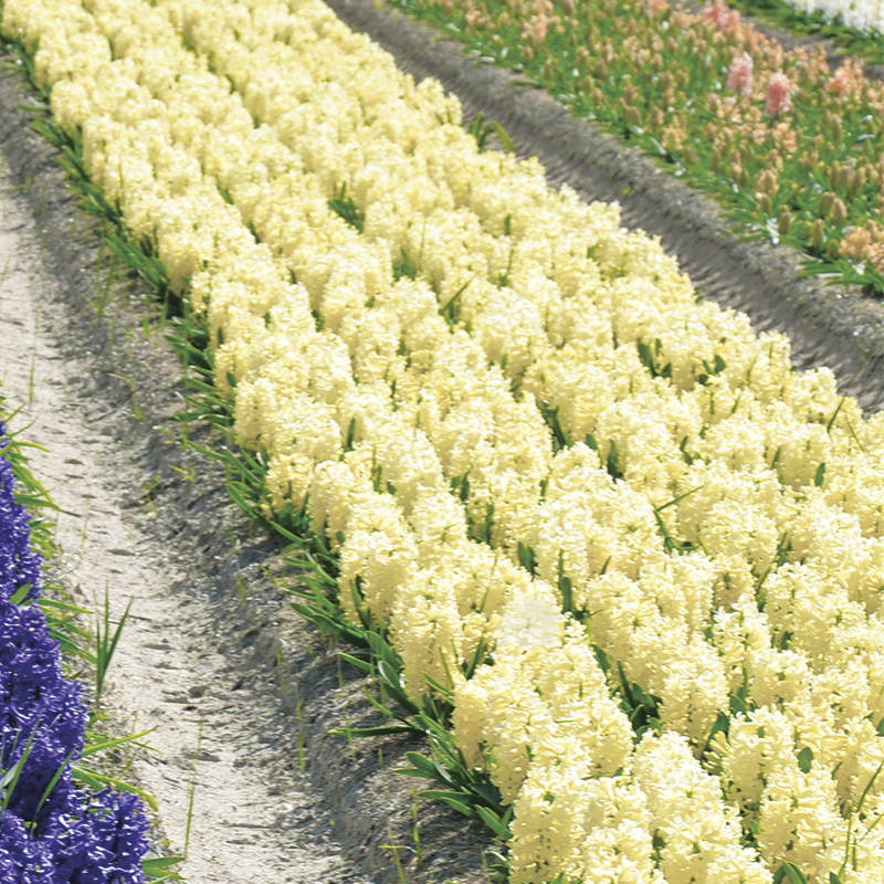Plantés en pleine terre, les bulbes de jacinthes n’ont pas besoin d’entretien particulier, mais juste d’un peu de patience car ils mettront quelques semaines avant de sortir de terre. Ils ne nécessitent ni engrais ni arrosage en début de culture, car ils fleurissent sur leurs réserves et bénéficient de l’eau qui tombe naturellement du ciel à cette saison. Veillez simplement à maintenir la terre fraiche en cours de floraison, particulièrement si une période de sécheresse intervient au moment de l’épanouissement des inflorescences. Après la floraison, supprimez les fleurs fanées pour éviter que les bulbes ne s’épuisent en produisant des graines, mais prenez soin de ne pas couper le feuillage avant qu’il ait fini de jaunir naturellement. Cette phase cruciale, associée dans l’idéal à un apport d’engrais une fois les fleurs fanées, est indispensable pour entretenir le feuillage et permettre au bulbe de reconstituer ses réserves pour refleurir généreusement l’année suivante. Les bulbes de jacinthes sont rustiques et peuvent être laissés en terre d’une année sur l’autre dans la mesure où votre sol est suffisamment drainant. Après quelques années, il est assez fréquent que la floraison dégénère ou s’amoindrisse ; il sera alors nécessaire de renouveler vos plantations. Quant aux bulbes forcés, ils ont en général épuisé beaucoup de leurs réserves. Ils peuvent être replantés au jardin, mais ils ne refleuriront probablement qu’après 1 ou 2 années de cycle végétatif au jardin.