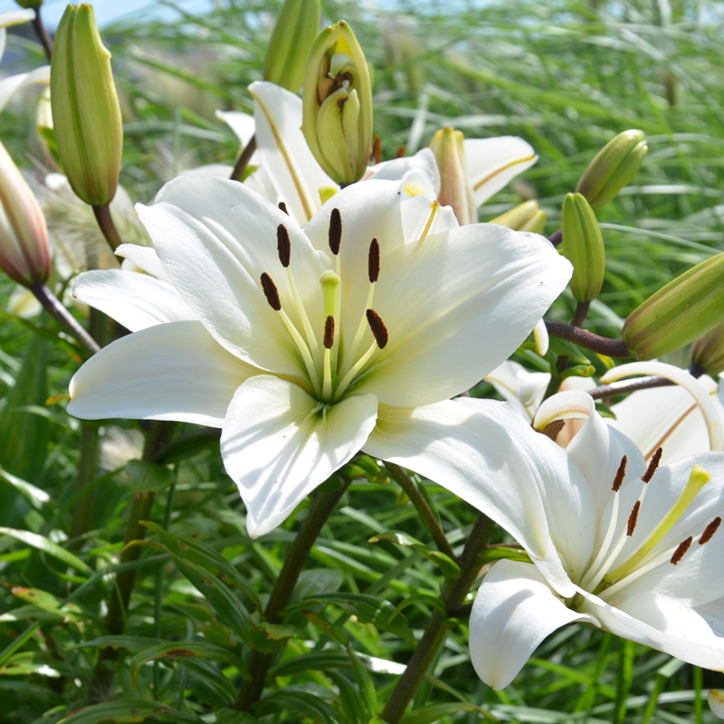 Le Lis Asiatique blanc est une vivace de 50 cm de haut environ, qui produit des tiges droites et bien érigées couvertes de petites feuilles vertes, au bout desquelles s’épanouissent, à partir de juin-juillet, des fleurs spectaculaires aux larges pétales d’un beau blanc crème. Chaque fleur est composée de 6 pétales entourant un pistil et 6 étamines bien apparentes. Cette variété compacte sera magnifique en association dans des massifs variés, mais également sur vos balcons et terrasses si vous choisissez de la cultiver en pot. D’origine chinoise, les Lis Asiatiques sont appréciés pour leur floraison majestueuse et raffinée, mais aussi pour leur bonne tenue en vase qui en fait une des fleurs les plus appréciées des fleuristes.