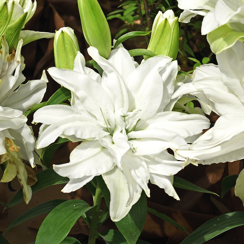Le Lis Oriental double blanc est une grande vivace de 80 cm de haut environ, qui produit des tiges droites et bien érigées couvertes de feuilles vertes, au bout desquelles s’épanouissent, à partir de juillet-août, des fleurs spectaculaires aux larges pétales blancs.