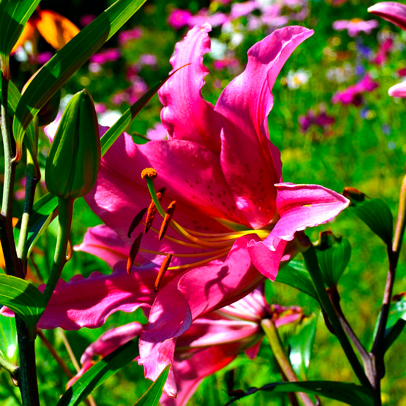 La première année, pratiquez des arrosages réguliers pour permettre aux bulbes de bien s’installer. Un apport mensuel d’engrais pour plantes fleuries favorisera une floraison généreuse. Supprimez régulièrement les fleurs fanées sans trop couper le feuillage afin d’éviter la production de graines qui épuisent les bulbes. Après la floraison, ne coupez le feuillage que lorsque celui-ci a fini de jaunir naturellement, pour lui permettre de reconstituer ses réserves et se multiplier. Si vous constatez la présence d’insectes rouges, les criocères du lis, ne tardez pas à les supprimer manuellement car leurs larves se montrent très friandes des fleurs et feuilles de ces belles liliacées. Une fois bien installés, les bulbes supportent les gelées et se naturalisent facilement pour se multiplier au fils des années et créer des taches de couleur de plus en plus généreuses.