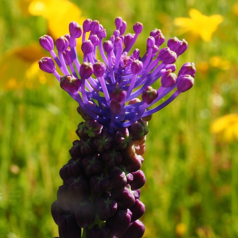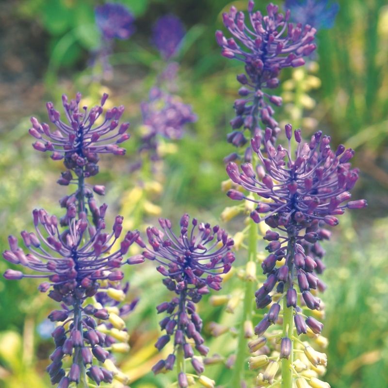 Le Muscari comosum est une petite bulbeuse originale à floraison printanière de 20 à 25 cm de hauteur, qui produit dès le mois de mars avril des grappes de petites fleurs en grelots surmontées d’un toupet de 4 à 5 cm de diamètre au coloris bleu indigo et violet. Plantés en tous types de sols fertiles, mais surtout bien drainants, ces muscaris se naturaliseront rapidement pour former avec le temps des touffes denses et généreuses qui s’accorderont à merveille avec des tulipes et narcisses précoces, ou encore des jacinthes et des anémones blanda. Avec leur petite taille, ils composeront également des potées fleuries charmantes et délicates qui signeront le retour du printemps sur votre balcon ou votre terrasse! Plante mellifère, elle sera une bonne source de nourriture pour les insectes butineurs du jardin au sortir de l’hiver.