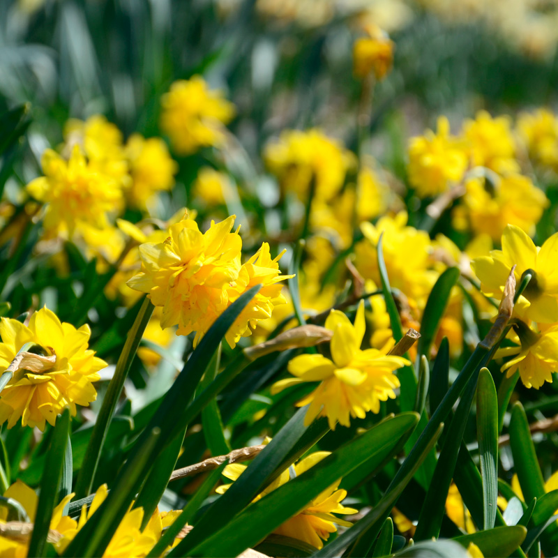 Plantés en pleine terre, les bulbes de narcisses n’ont pas besoin d’entretien particulier, mais juste d’un peu de patience car ils mettront quelques semaines avant de sortir de terre et d’illuminer vos massifs aux premiers beaux jours du printemps. Ils ne nécessitent ni engrais ni arrosage en début de culture, car ils fleurissent sur leurs réserves et bénéficient de l’eau qui tombe naturellement du ciel à cette saison. Veillez simplement à maintenir la terre fraiche en cours de floraison, particulièrement si une période de sécheresse intervient au moment de l’épanouissement des fleurs. Après la floraison, supprimez les fleurs fanées pour éviter que les bulbes ne s’épuisent en produisant des graines, mais prenez soin de ne pas couper le feuillage avant qu’il ait fini de jaunir naturellement. Après avoir coupé les fleurs, un apport d’engrais pourra également aider le bulbe à reconstituer ses réserves pour refleurir généreusement l’année suivante. Les narcisses sont rustiques et peuvent rester en terre d’une année sur l’autre. Ils se naturalisent également très facilement, particulièrement les narcisses botaniques qui formeront rapidement des touffes compactes et denses