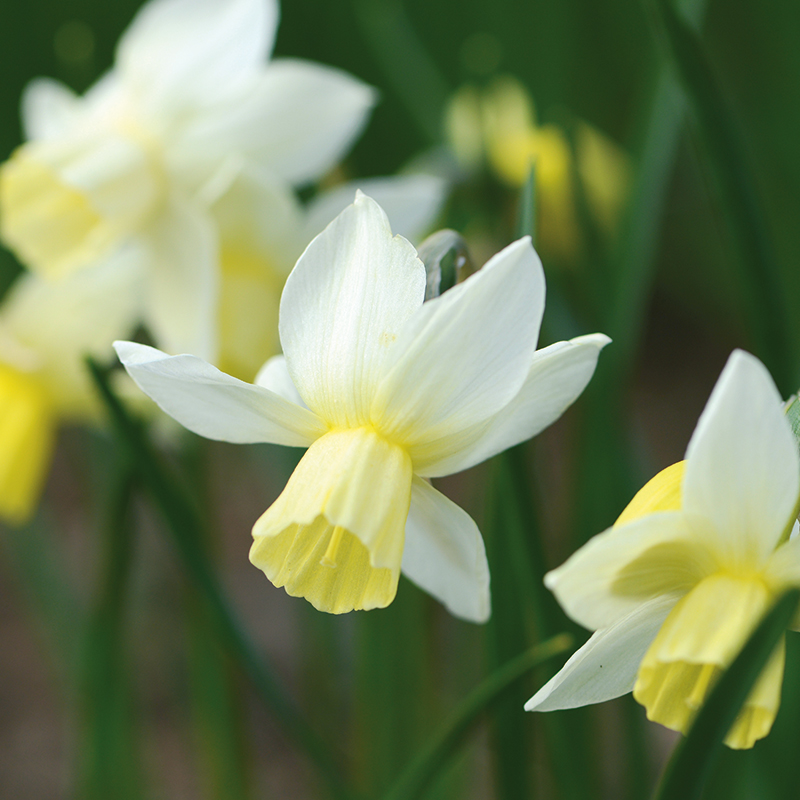 Plantés en pleine terre, les bulbes de narcisses n’ont pas besoin d’entretien particulier, mais juste d’un peu de patience car ils mettront quelques semaines avant de sortir de terre et d’illuminer vos massifs aux premiers beaux jours du printemps. Ils ne nécessitent ni engrais ni arrosage en début de culture, car ils fleurissent sur leurs réserves et bénéficient de l’eau qui tombe naturellement du ciel à cette saison. Veillez simplement à maintenir la terre fraiche en cours de floraison, particulièrement si une période de sécheresse intervient au moment de l’épanouissement des fleurs. Après la floraison, supprimez les fleurs fanées pour éviter que les bulbes ne s’épuisent en produisant des graines, mais prenez soin de ne pas couper le feuillage avant qu’il ait fini de jaunir naturellement. Après avoir coupé les fleurs, un apport d’engrais pourra également aider le bulbe à reconstituer ses réserves pour refleurir généreusement l’année suivante. Les narcisses sont rustiques et peuvent rester en terre d’une année sur l’autre. Ils se naturalisent également très facilement, particulièrement les narcisses botaniques qui formeront rapidement des touffes compactes et denses