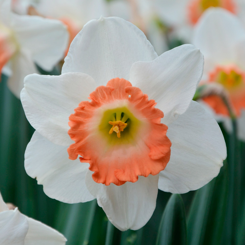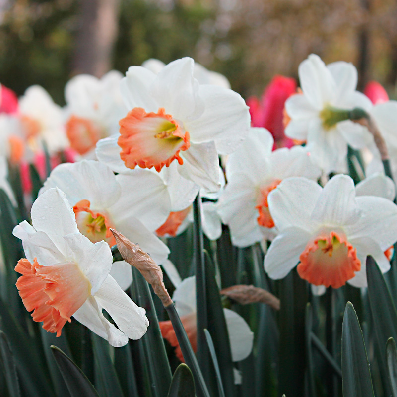 Le Narcisse Grande Coupe Pink Charm est une magnifique bulbeuse de 45 cm de hauteur, qui produit en mars avril des fleurs de 8 cm de diamètre au coloris blanc à la coupe ivoire et saumon. Planté en groupe resserré, ce narcisse à la trompette large et évasée sera spectaculaire en massif ou en bordure, mais aussi en vase où il composera de magnifiques bouquets printaniers. En pot ou jardinière, cette variété sublimera vos balcons et terrasses en association avec d’autres bulbeuses à floraison hâtive comme les tulipes Triomphe, les muscaris ou les jacinthes orientales. Une chose est sûre, ces narcisses lumineux à la floraison durable signeront l’arrivée du printemps au jardin !